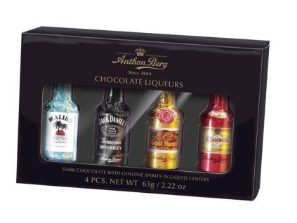 Luxusní, samostatně balené pralinky v podobě čokoládových lahviček s krémovou likérovou náplní.