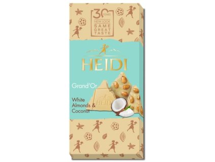 Bílá čokoláda s celými karamelizovanými mandlemi a kokosovými vločkami.