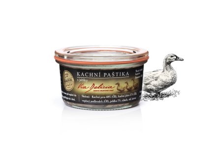 Paštika z kachního masa a kachních jater, doplněná o jablíčka a restovanou cibulku.