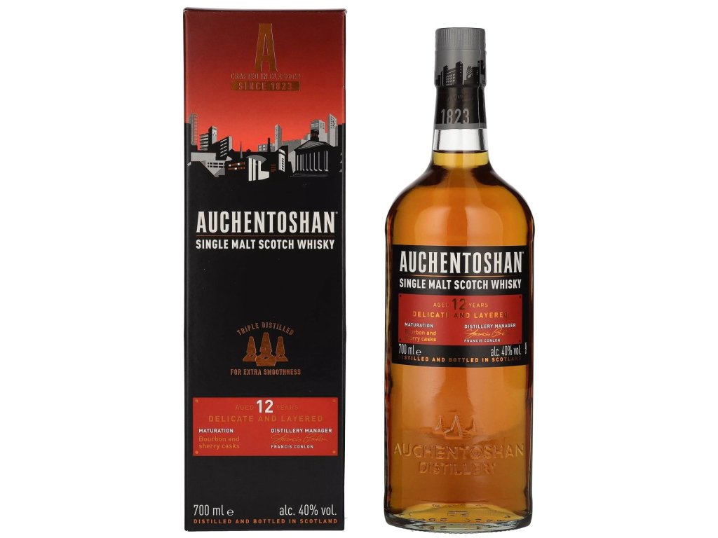 12letá Auchentoshan (v dárkovém balení) je novou single malt whisky této značky, která nahradila svou desetiletou předchůdkyni. Aroma této oceňované whisky je obilné, se stopami exotického ovoce. Chuť je plná tříslovin, zároveň sladká po ječmenu a vanilce. Závěr je suchý, dlouhý a jemně nasládlý.