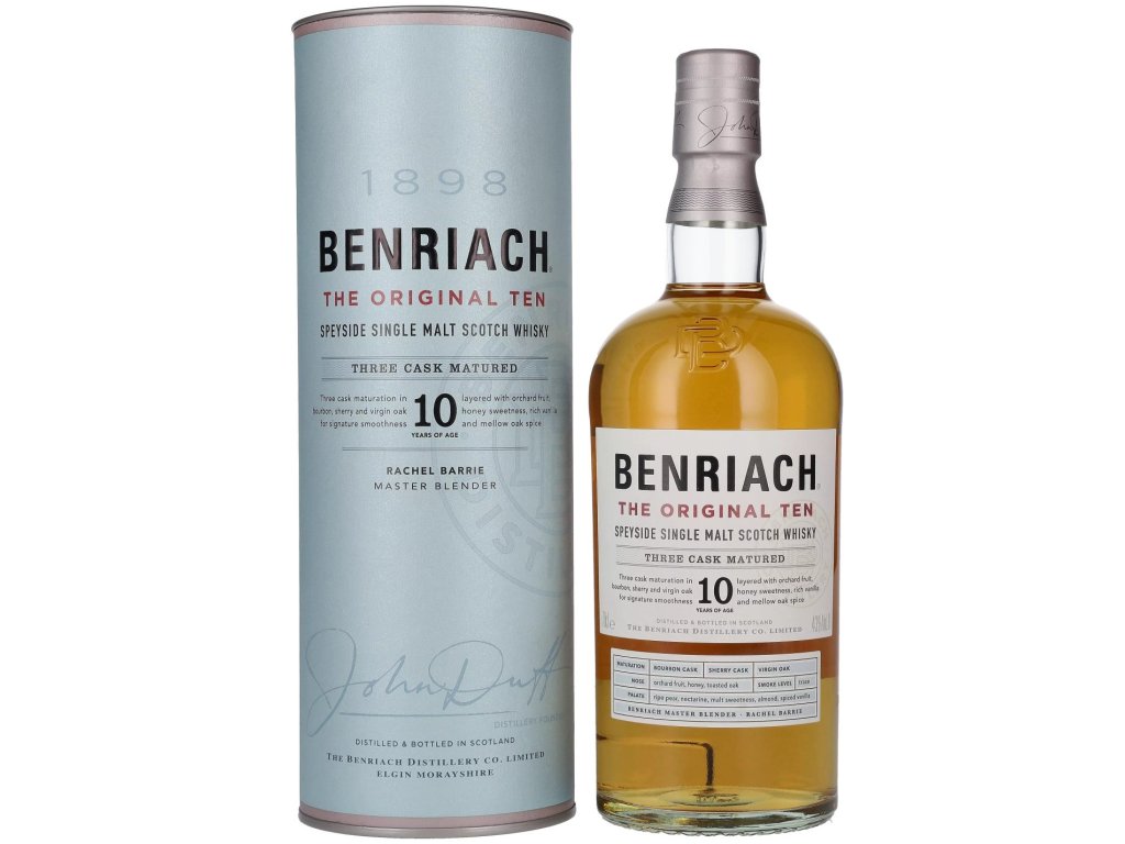 BenRiach 10yo zraje v ex-bourbon a sherry sudech.Tento čerstvý, živý, ovocem naložený sladový slad zachycuje dubové koření, zelené jablko, sušené meruňky, broskve, banány a jemný nádech anýzu.