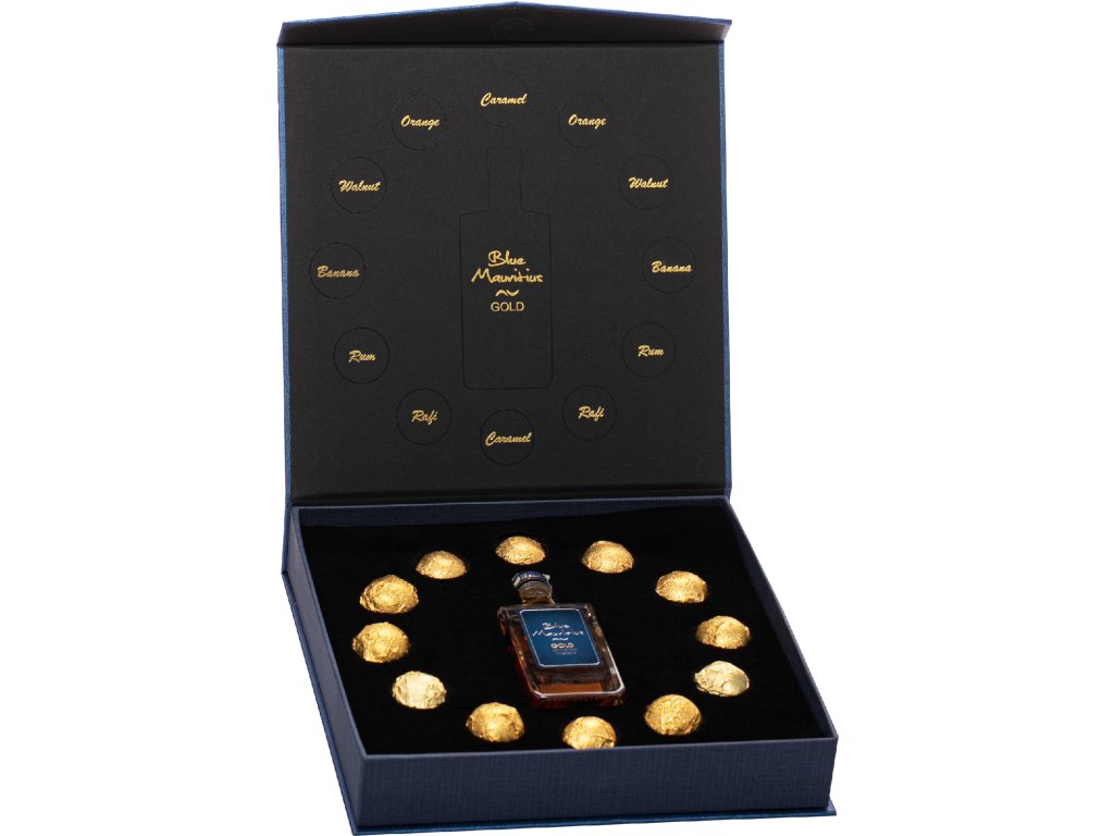 V dárkovém balení najdete miniaturu rumu Blue Mauritius a 12 kusů čokoládových pralinek. Pralinky jsou vyrobeny českým mistrem Benjaminem Kovaříkem, který byl oceněn anglickou královnou.