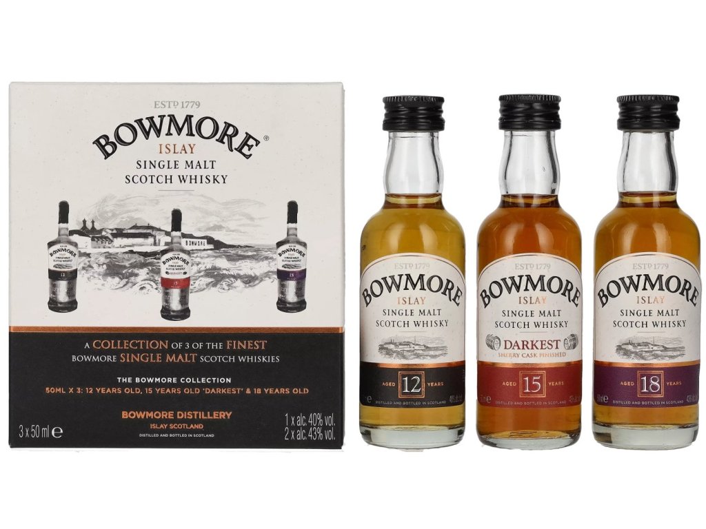 Jedinečné dárkové balení obsahuje tři různě staré ochutnávkové miniatury od této značky: 12letou Bowmore Whisky, 15letou Bowmore Darkest Sherry Cask a 18letou Bowmore Malt.
