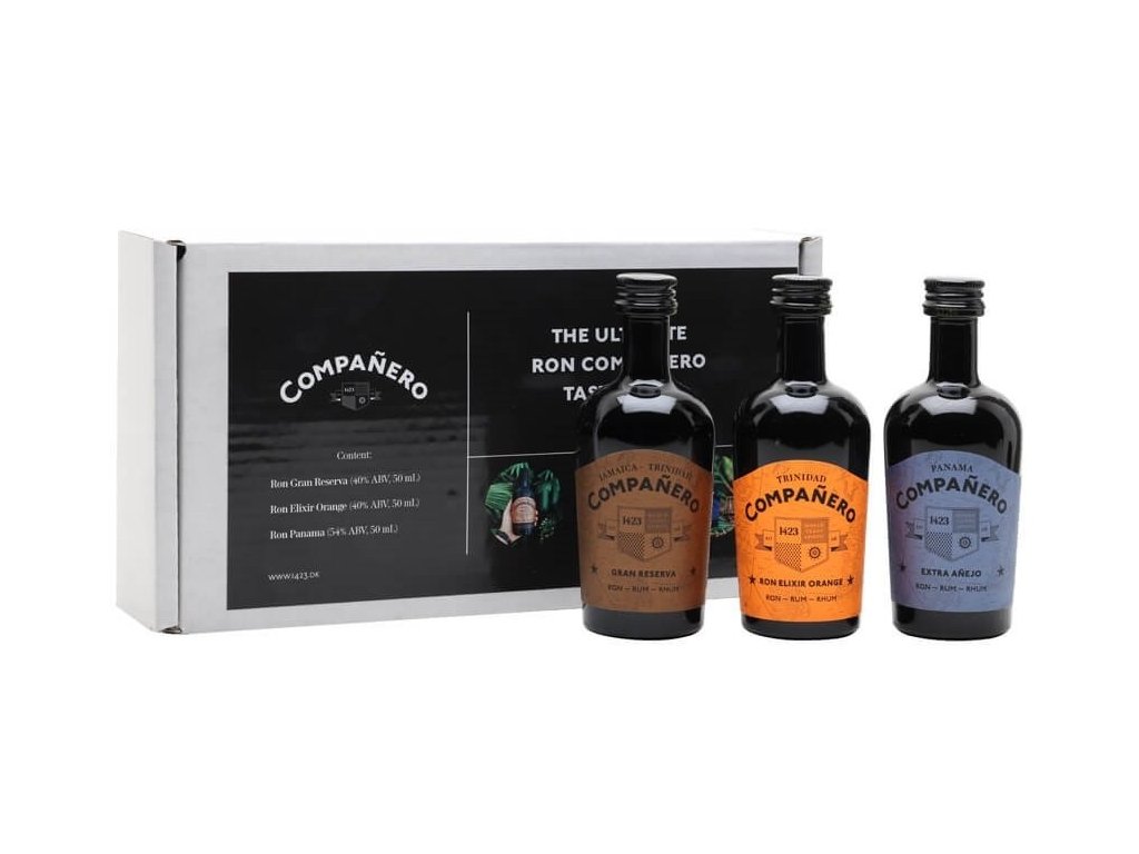 Ochutnávková sada Companero obsahuje tři vzorky rumů této značky. Companero Gran Reserva, Companero Ron Elixir Orange a Companero Extra Anejo 12yo.