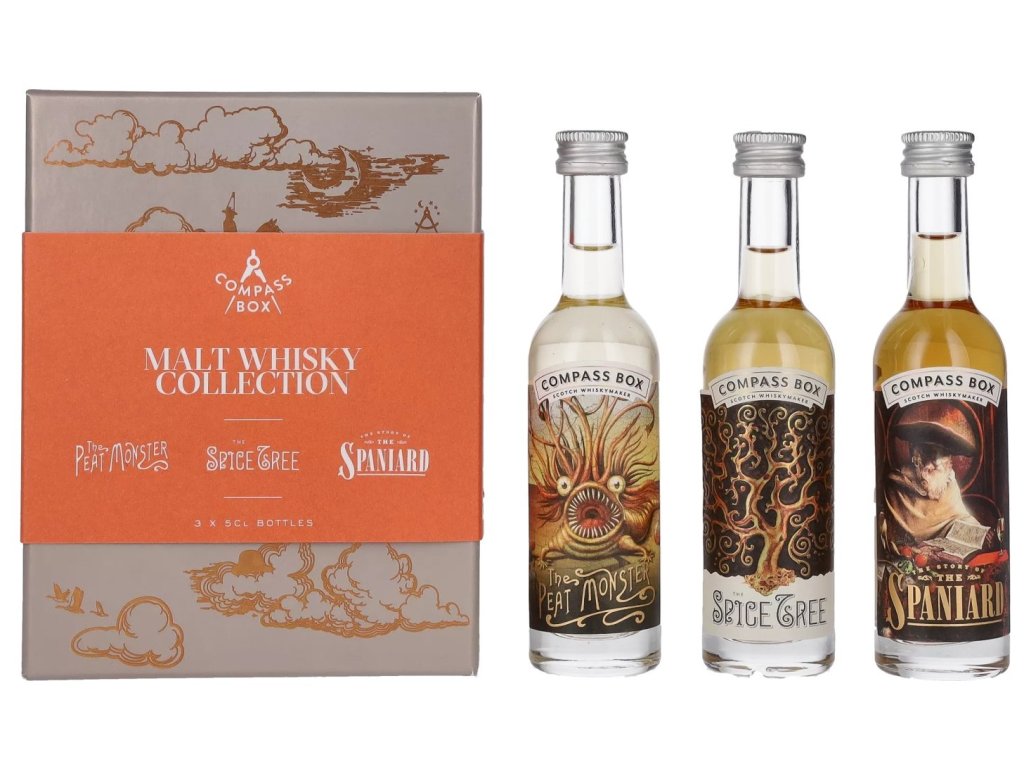 Whisky set pro milovníky komplexních, vícevrstvých rašelinových whisky. Dárkový set obsahuje tři miniatury (THE PEAT MONSTER Blended Malt, Compass Box SPICE TREE Blended Malt, Compass Box THE SPANIARD Blended Malt)