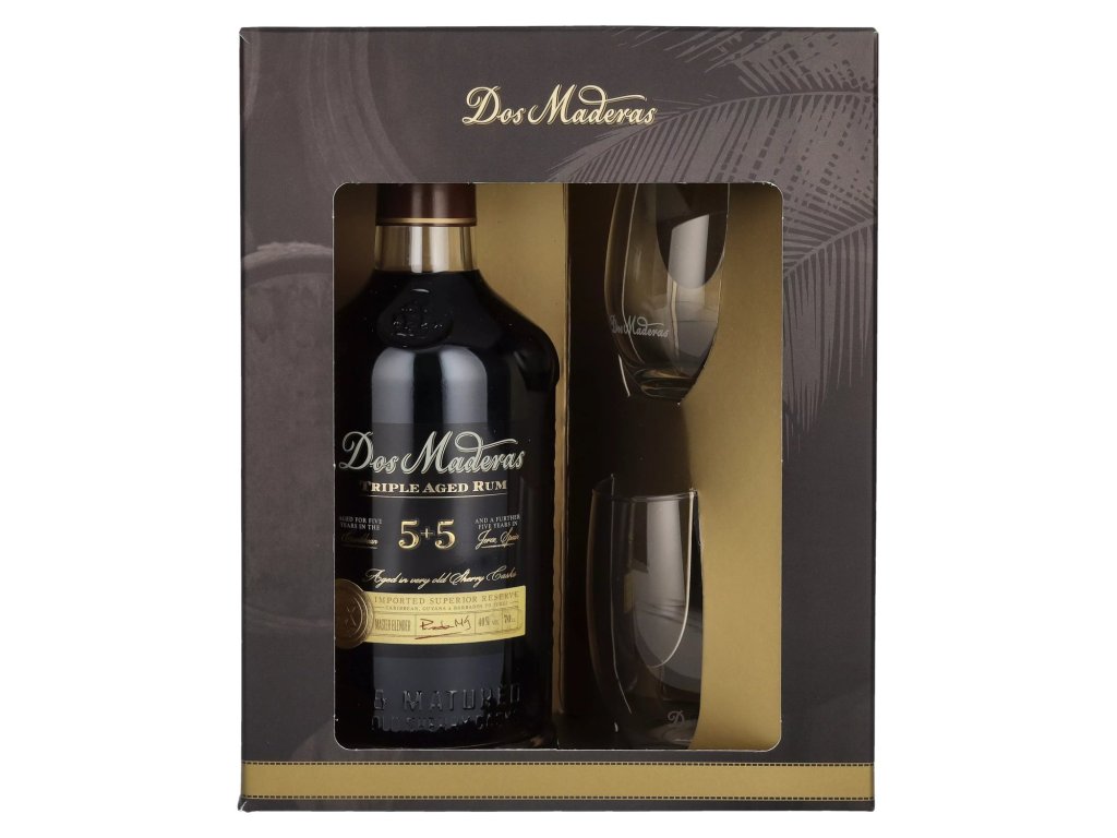 Ochutnejte desetiletý rum Dos Maderas 5+5 v exkluzivní dárkové krabici se dvěma sklenicemi. Dos Maderas je unikátní především díky třístupňovému procesu zrání.