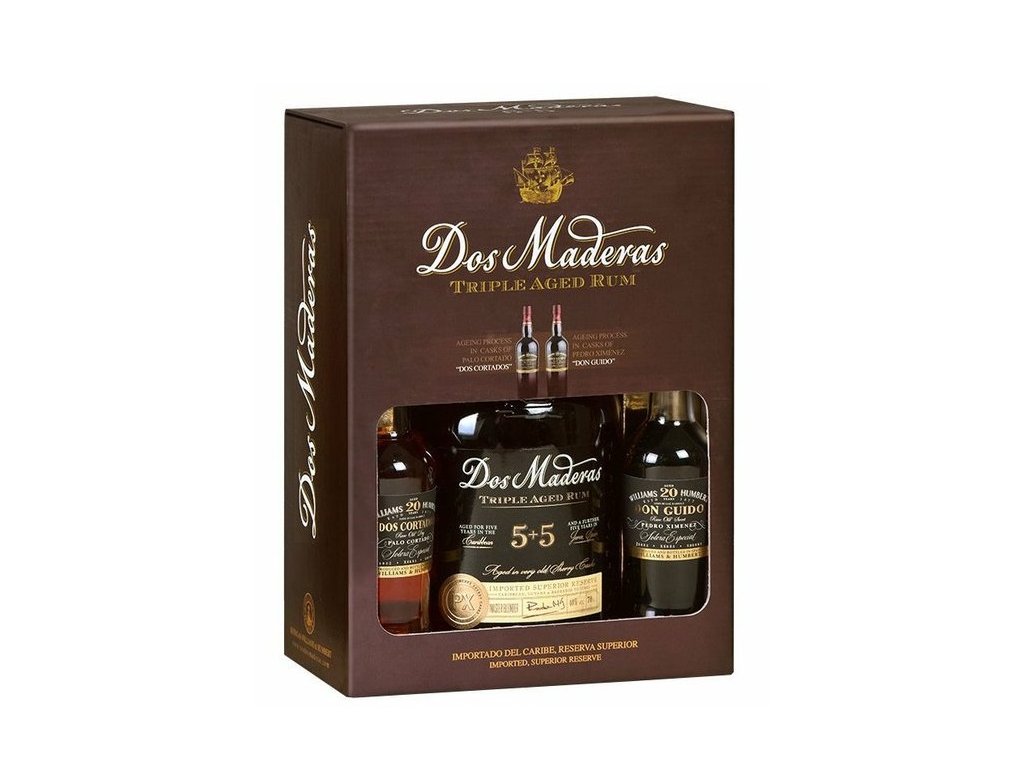 Dos Maderas PX 5+5 (0,7 l) + 2x Sherry (10 cl) je nové dárkové balení oblíbeného karibského rumu, ve kterém naleznete lahev rumu Dos Maderas PX 5+5 a dvě 10cl miniatury Sherry Pedro Ximenez, což je sherry, v jehož ex-sudech rum Dos Maderas dozrává.