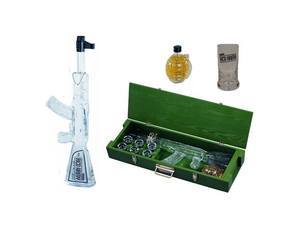 Puška Kalashnikov je pravděpodobně nejznámější zbraní na světě. Skleněná dárková verze této pušky naplněná 1 litrem výborné vodky se šesti štamprlemi a dvoudeckovým cvičným granátem je proto skvělým dárkem pro nejednoho milovníka zbraní a alkoholu.