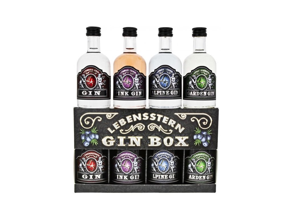 Lebensstern Gin Box je dárkové balení čtyř miniatur (Lebensstern Dry Gin, Lebensstern Pink Gin, Lebensstern Alpine Gin, Lebensstern Garden Gin).