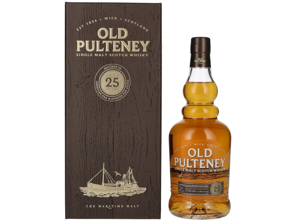 Old Pulteney 25yo je vrcholem řemeslného umění této slavné palírny přezdívané "maritime malt". Tato whisky zraje nejprve v sudech po bourbonu a následně dozrává v ručně vybraných sudech po sherry, což jí dodává hloubku a eleganci. V chuti se mísí tóny sušeného ovoce, karamelu, vanilky a čokolády s charakteristickou mořskou solí. Obsah alkoholu 46 % podtrhuje intenzitu a bohatost této whisky, která si zachovává plnou hloubku díky nefiltrování za studena. Ideální pro znalce, kteří hledají mimořádný zážitek.