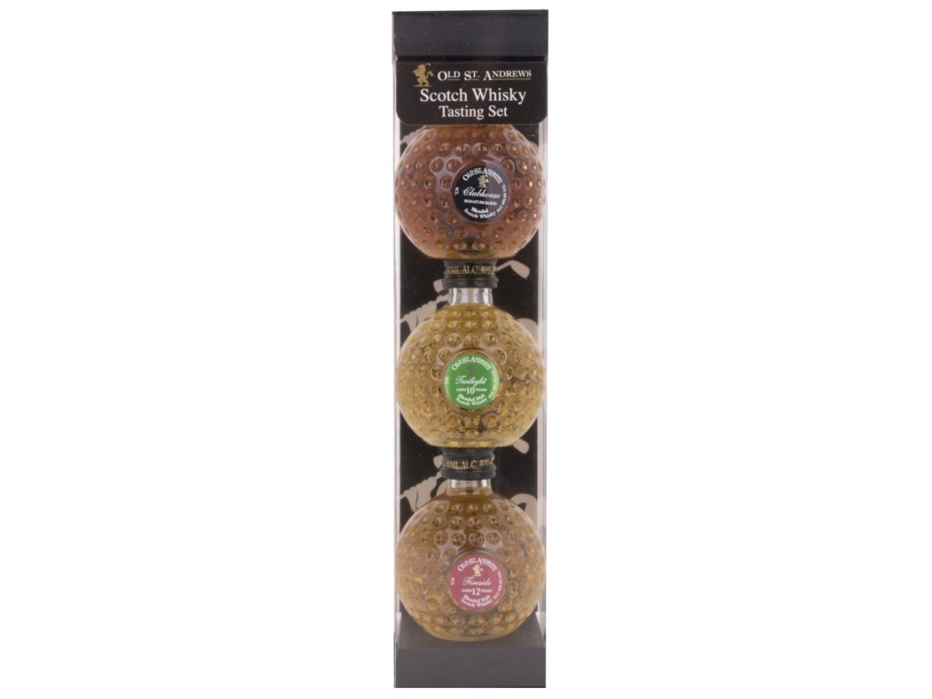 Old St. Andrews Blended Bottles Tasting Set je degustační sada tří miniatur blended scotch whisky, každá o objemu 0,05L. Každá whisky má jedinečný chuťový profil, který nabízí harmonii ovocných, vanilkových a kořenitých tónů. Ideální jako dárek nebo pro ochutnávání.