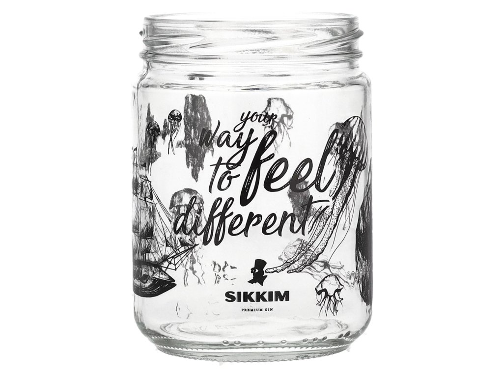 Skleněný džbánek Sikkim Gin pro perfektní koktejl Gin&Tonic. Na zadní straně dvě kalibrační čáry 2cl a 4cl.