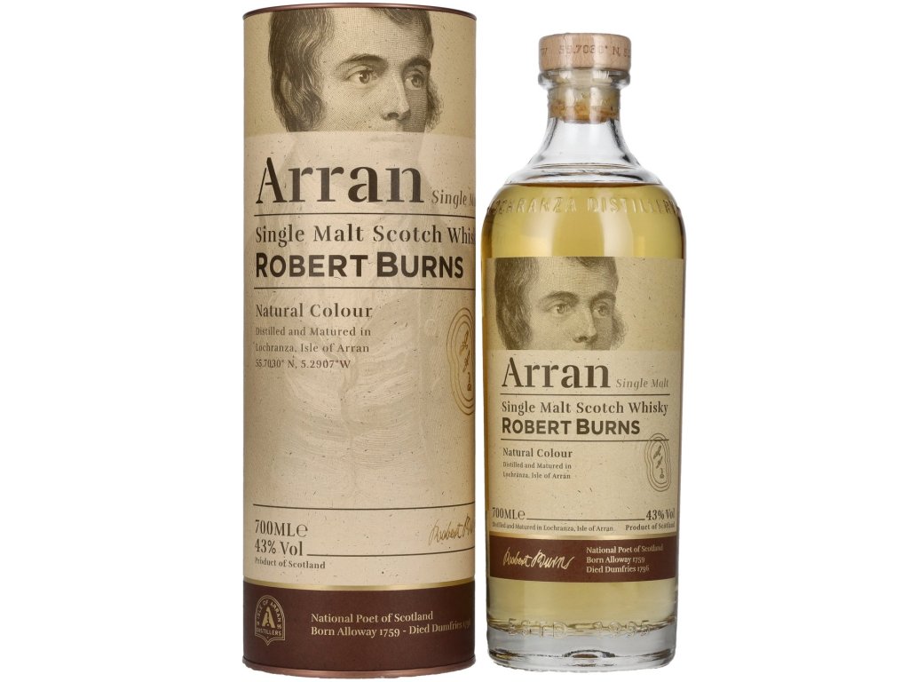 The Arran Robert Burns Whisky 5yo je součástí kolekce věnované slavnému skotskému básníkovi Robertu Burnsovi. Tato mladá whisky, která zraje 5 let, pochází z relativně nové palírny Arran, jež zahájila svou produkci v roce 1995. Přesto si palírna rychle vybudovala vynikající reputaci díky svým vysoce kvalitním produktům, které si okamžitě získaly přízeň milovníků whisky.