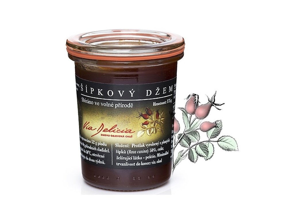 Složení: dužnina z planých šípků 59 %, cukr, pektin, citronová šťáva. Po otevření uchovávejte v chladu při 6 °C a spotřebujte do 3 dnů.