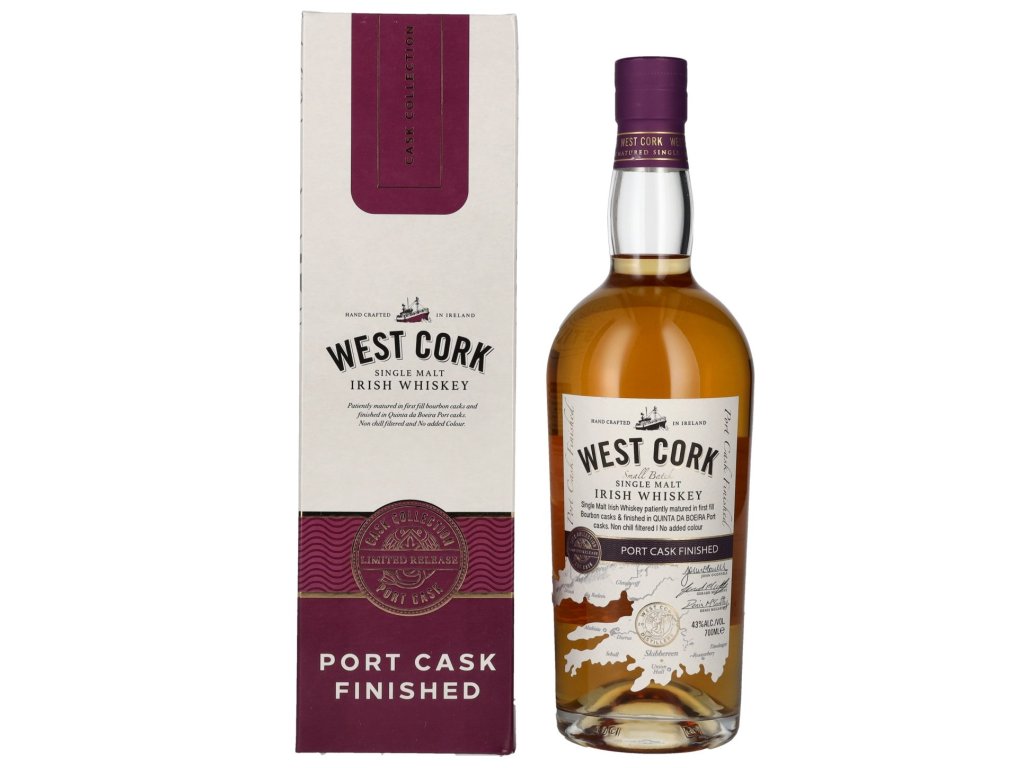 West Cork Port Cask Finished Single Malt Irish Whiskey je jemná irská whisky, která zrála v sudech po bourbonu a dozrávala v sudech po portském vínu Quinta Da Boeira. Bez filtrace za studena a bez přidaného barviva.