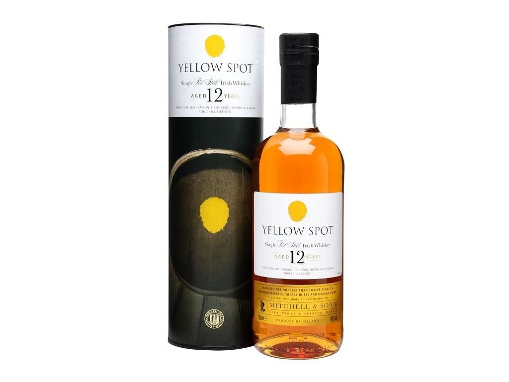 Yellow Spot 12letá Whiskey je výjimečná irská single pot still whiskey, která svůj název získala díky označení sudů, ve kterých zraje – Žlutá skvrna označovala 12letý proces zrání. Tento unikátní proces zrání se odehrává ve třech různých typech sudů, což dodává whiskey bohatou a komplexní chuť. Nejprve se ukládá do sudů po bourbonu, které přinášejí jemné vanilkové a dřevité tóny. Poté je whiskey přemístěna do sudů po sherry, kde získává sladké a ovocné tóny, a nakonec zraje ve španělských sudech po vínu Malaga, které přidávají jemnou sladkost a hloubku.