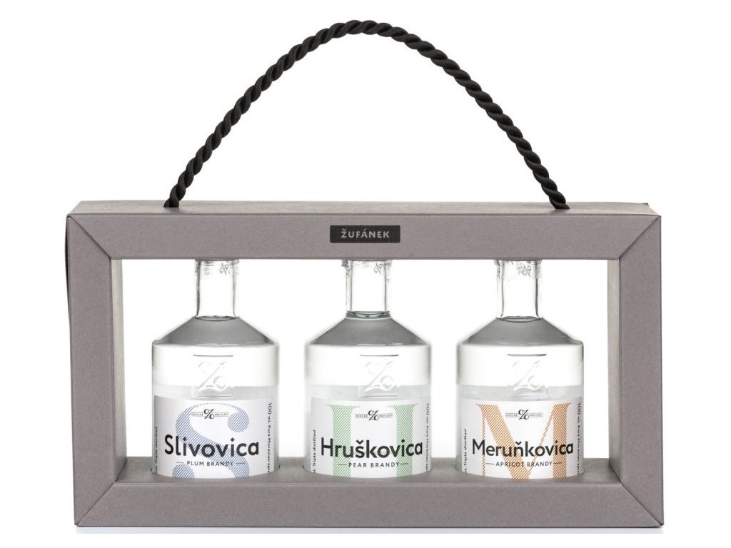 Žufánek odnoska destilátů je dárkový box obsahující výběr skvělých pálenek tohoto rodinného lihovaru v ochutnávkových miniaturách (0,1 l). V sadě najdete Slivovici, Hruškovici a Meruňkovici.